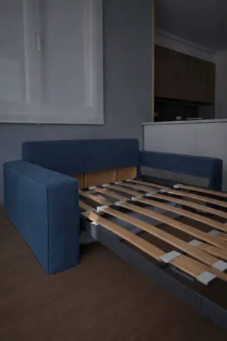 Vendo sofá cama de diseño moderno, perfecto para piso, estudio o habitación de invitados. • Medidas cerrado: aprox. 178 cm de ancho x 76 cm de fondo, altura 70 cm. • Medidas abierto: 178 cm x 95 cm, altura 35 cm. • Material: estructura y patas de madera, tapizado en tela gris. • Capacidad: dos plazas, reclinable. • Estado: muy bueno y funcional; tiene algunos hilos sueltos y los forros traseros están rotos, pero no afecta en nada a su uso ni a su estética frontal. • Precio: 120 € (por debajo del precio medio). Es muy cómodo, fácil de abrir y cerrar, y encaja genial en cualquier decoración. Ideal para quienes buscan calidad y