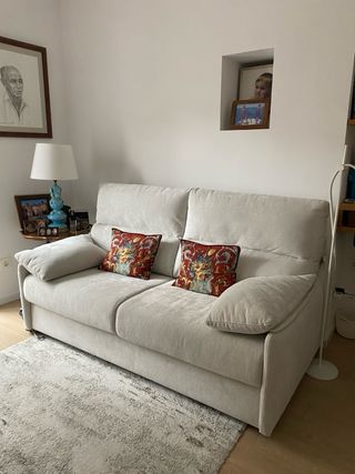 ¡Como nuevo! Vendo sofá cama de Gama alta. Lo compramos hace menos de un año y está en perfecto estado. Lo vendemos por que nos múdaremos fuera del país y cuesta el doble llevárnoslo. Es el modelo premium con el colchón de 18 cm de grosor, lo que lo hace cómodo de verdad para dormir a diario, no como los sofás cama convencionales. Uso casual de sofá y como cama un par de veces para una visita casual,prácticamente nuevo. Características principales: Medidas: 180 cm de ancho Cama: 140 x 190 cm Alta calidad colección sostenible Estado: Impecable, sin manchas ni desperfectos. Muy poco uso. Precio actual en tienda: 1699 €