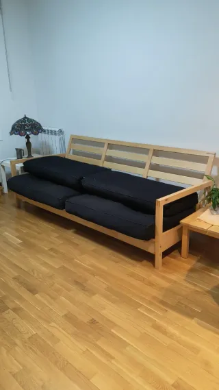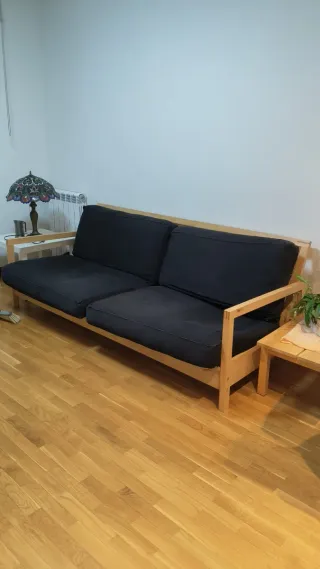 Precioso sofá-cama de Ikea, ideal para tu salón o habitación de invitados. Su diseño moderno y funcional se adapta a cualquier espacio. *Recoger en Aia pueblo. Guipúzcoa - Estructura de madera clara. - Cojines de asiento y respaldo en color negro. Medidas: 2,07 largo 93 ancho 75 altura cm