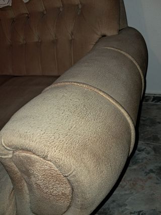 Sofá de tres plazas de estilo vintage. Es sofá cama. Es de color marrón y está hecho de tela. - Tapicería capitoné. - Reposabrazos robustos. - Incluye tres cojines.