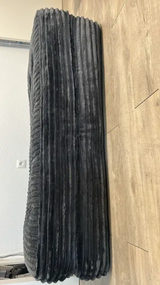 Sofá cama de tela en tono gris oscuro negro. Su diseño acanalado le da un toque moderno y acogedor. - Tapicería de tela aterciopelado con textura acanalada. - Color gris oscuro. Precio negociable