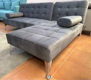 Sofá cama moderno en color gris, con un acabado suave de terciopelo. - Diseño capitoné. - Patas metálicas. - Incluye cojines.