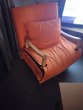 Cómodo sillón cama individual, ideal para espacios pequeños. Se pliega fácilmente. - Perfecto para una persona. - Estructura de madera. - Tapizado de tela color naranja. - Incluye un cojín.