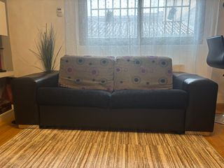 Este sofá cama combina funcionalidad y estilo para tu hogar. Su diseño versátil se adapta a diferentes espacios. Incluido el conjunto de los dos sofás. Los laterales de polipiel están desgastados pero con una funda se puede utilizar.