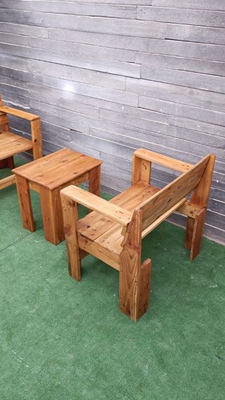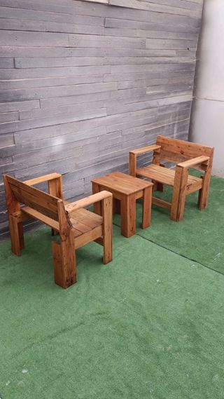 Conjunto rústico de mesa y dos sillones, perfecto para un ambiente acogedor. Se compone de mesa baja y dos sillones. Hechos artesanalmente de palets, todo nuevo. No está pintado para que el comprador pueda elegir el tono, de ahí el bajo precio. Miden: los sillones tienen de alto 70cm los dos, de ancho, uno 52cm , el otro, 50cm. La mesa mide 50cm x 50cm de tablero x 50cm de alta. Se puede comprar por unidades. Los sillones a 30€, la mesa 20€