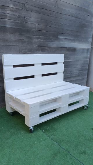 Banco hecho a mano con palets, ideal para exteriores. - Estructura de madera robusta. - Acabado pintado en blanco. Tiene ruedas, se divide en 2 partes, para mejor transporte se ve en la foto 2. Mide de largo 1,20. Hace falta mano de pintura