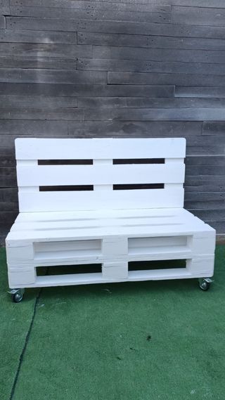 Banco hecho con dos palets de madera, pintados de blanco. Tiene ruedas para facilitar su movimiento. Es un banco robusto y sencillo, ideal para un balcón o jardín. - Medidas 120 cm ancho 47 cm fondo asiento 50,5cm fondo con respaldo 36cm altura al asiento 90cm altura con respaldo