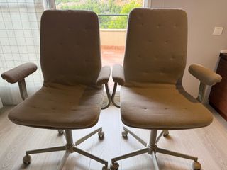 20€ las dos sillas. Muy cómodas Conjunto de dos sillas de oficinacon un diseño moderno y funcional. Son cómodas y resistentes. - Estructura metálica. - Asiento y respaldo acolchados. - Brazos integrados. Desconozco la marca