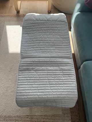 Sillón de lactancia reclinable con tela de terciopelo que se limpia muy bien. Es acolchado, permitiéndote tener los brazos apoyados si estás leyendo o si, como en mi caso, tienes el bebé encima. Se saca un soporte para levantar los pies y se puede echar el respaldo para atrás, quedando prácticamente en posición tumbada. Es muy cómodo y bonito.