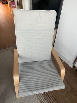 Cómodo sillón POÄNG de Ikea con un diseño moderno y elegante. Su estructura de madera y cojín acolchado ofrecen un gran confort. - Cojín acolchado en color gris. - Estructura de madera curvada. Ideal para periodo de lactancia por la posibilidad de usarlo como mecedora. Está lavada y en perfecto estado de uso. Está en Tres Cantos, pero se pueden dejar en San Sebastián de los Reyes, Getafe o zona Gran Vía