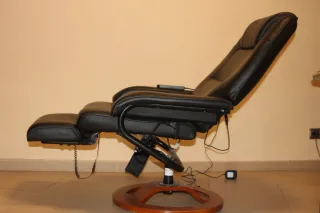 Este sillón de masaje ofrece comodidad y relajación. - Tapicería de cuero. - Base de madera. - Mecanismo reclinable.