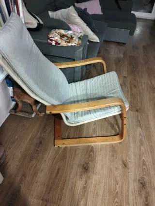 Cómodo sillón de Ikea con un diseño moderno y elegante. - Estructura de madera curvada. - Tapicería de tela suave al tacto. Usado siempre con una manta para que no se manche.