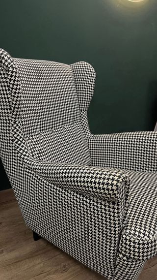 Sillón orejero STRANDMON con un diseño clásico y elegante. Como nuevo. Muy poco uso. precio unidad 130€. - Tapicería de tela con estampado pata de gallo. - Patas de madera oscura.