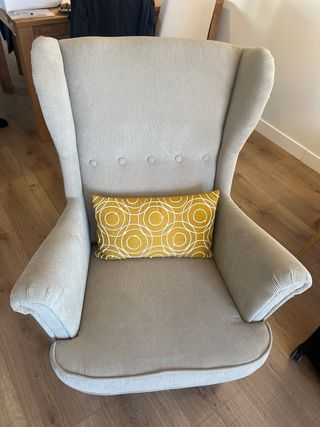 Vendo sillón orejero STRANDMON de Ikea en color gris oscuro + funda beige por si quieres cambiar de color. Ambas tapicerías están en perfecto estado. Vendo por cambio de habitación infantil. Precio original del sillon: 239€ Precio de la funda: 49.99€