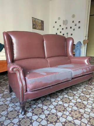 Sofá de orejero con un diseño clásico y elegante. Tapicería en piel sintética de color marrón. Ya está bastante usados, pero si pones algo encima de los colchones sé ve perfecto. La mamta no está incluida.