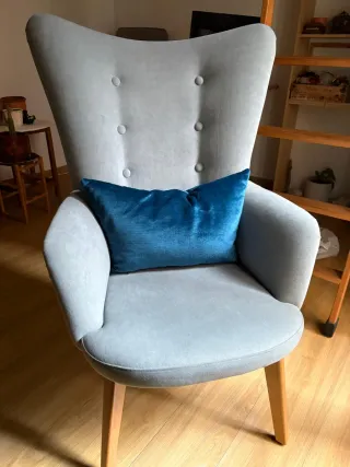 Sillón de tela gris con respaldo alto y apoyo y patas de madera. Elegante sillón orejero en primer plano, con tela de alta calidad. Costuras detalladas y construcción robusta. Esta muy bien, hace falta limpiar lo, por eso el precio. Nuevo vale 239€ Tela: 100 % poliéster (90 % reciclado como mín.) Estructura: Contrachapado, Tablero de partículas, Madera maciza Cojín de asiento: Poliuretano 35 kg/m3 Pata: Madera maciza, Laca pigmentada