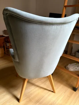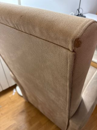 Amplio sillón orejero. Color muy neutro queda bien en cualquier sitio. Material como una terciopelo o pana. Se ve en foto A la altura del asiento tiene dos quemadas . Que no se ven cuando pones cojin como se ve en foto y el cojin le das la vuelta por la otra cara y tan poco. Asi que vomo se ve en fotos no se ve nada. Patas de madera -Buen estado -.