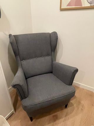 Acogedor sillón orejero de Ikea, perfecto para crear un rincón de lectura. - Diseño clásico y elegante. - Patas de madera oscura.
