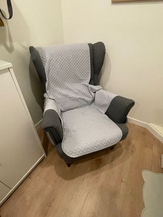 Sillón clásico orejero de una plaza. Color gris. Cojín y respaldo muy cómodos. Se había estado utilizando con una funda protectora, recomendable. Tela íntegra completamente, manchas de uso en la tapicería, lavables. Ligero de peso para fácil movilización. Patas de madera niveladas y sin cojear. Se entrega en zona cc.diagonal mar, no envíos.