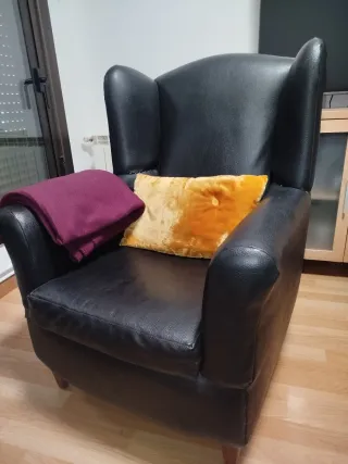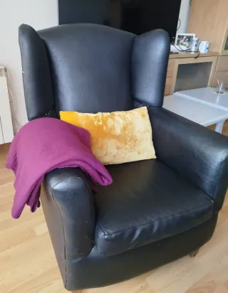 Elegante sillón orejero tapizado en piel negra, muy cómodo y en muy buen estado. Perfecto para salón, despacho o rincón de lectura gracias a su respaldo alto y brazos envolventes, que hacen que sea muy cómodo para descansar o leer. ✔️ Muy cómodo ✔️ Tapizado en piel negra fácil de limpiar ✔️ Diseño elegante que combina con cualquier decoración ✔️ Buen estado, sin roturas ni manchas Medidas: 70 cm (ancho) 75 cm (fondo) 97 cm (alto) 📍 Recogida en Nou Barris (Barcelona) – fácil acceso para cargar en coche. Si ves el anuncio sigue disponible. butaca, sillón lectura, sillón salón, sillón