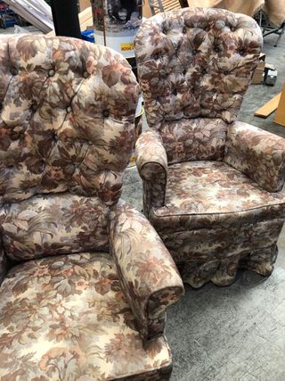 2 Sillones orejeros de tela estampada. En muy buenas condiciones pero los vendo por mudanza y me gustaría encontraran un nuevo hogar. Tienen unas pequeñas marcas en los laterales exteriores de las orejas, que se ven en la última foto. Ancho 0,79m x Alto 1,05m x Fondo 0,58m