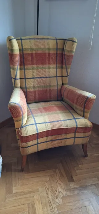 Acogedor sillón orejero de cuadros. - Tapicería de tela. - Estructura de madera.
