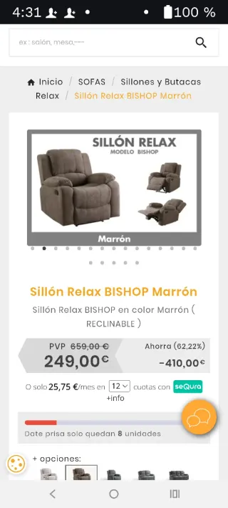 Vendo sillóne relax con sistema de reclinación manual en color gris marengo. Es ideal para descansar, ver la televisión o leer, ya que permite elevar los pies y reclinar el respaldo casi por completo. Características: Mecanismo: Reclinación manual mediante palanca lateral (funciona perfectamente). Estado: Muy buen estado estructural, cómodo y mullido. El tapizado tiene el desgaste normal del uso, pero está bien cuidado , solo hay un pequeño descosido y no es roto es descosido por eso el precio. Pensar qué precio original 395 € Color: Gris oscuro/marengo, combina con cualquier salón. Dimensiones: preguntar