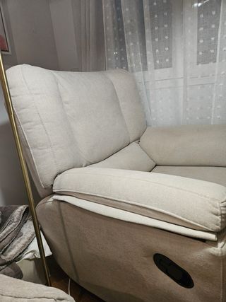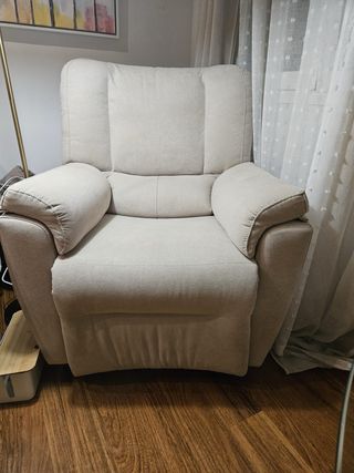 Cómodo sillón reclinable en perfecto estado, con muy poco uso. Diseño Modelo Madrid de HOME DESING & CONFORT Apertura lateral, repelente a manchas - Tapizado en tela. - Color beige neutro.