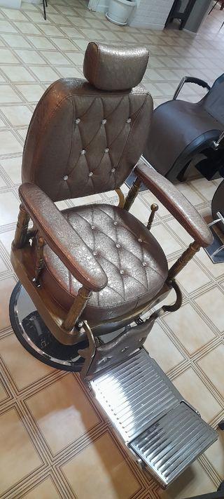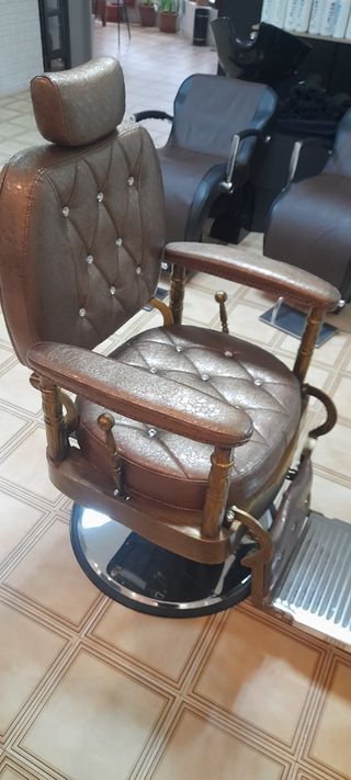 Sillon profesional de barbería, en color marrón y dorado, reclinable y elevador de altura hidráulico. En perfecto estado.
