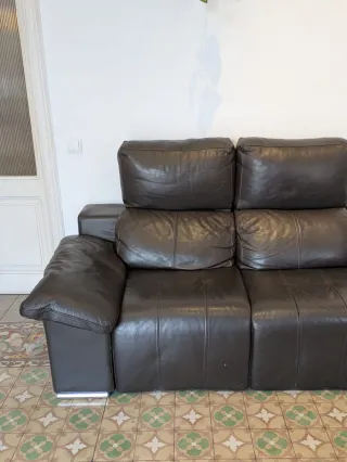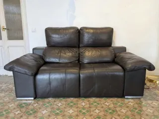Sofá de dos plazas con sistema relax. - Tapicería de piel. - Color marrón oscuro. - Costuras decorativas. - Sofa Danubio 3 plazas 2 relax eléctricos, cabezales eléctricos - Practicamente nuevo, hizo 1 año en septiembre, sin manchas, desgastes ni rozaduras - muy cómodo, se vende por cambio de vivienda - En su momento costo 2000e