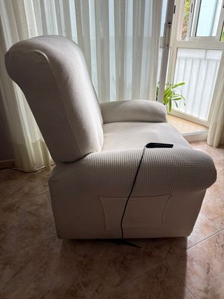 Se ha usado muy poco. Sillón relax tapizado. Lleva sistema Power Lift, un mecanismo articulable que levanta verticalmente el sillón para permitir a la persona a levantarse con mayor facilidad. Incorpora dos motores que hacen que el movimiento del respaldo y del resposapiés sean independientes. Se acciona con un mando incorporado. Medidas: 75 (ancho) x 90 (fondo) x 108 (alto) cm