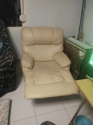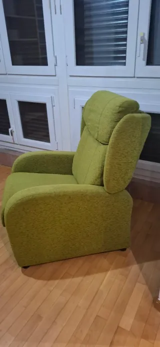 "Sillón relax reclinable con reposapiés extraíble. Muy cómodo y en perfecto estado, sin roturas ni manchas. Ideal para salón o zona de lectura. Funciona perfectamente."