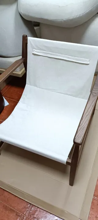 Sillón Kave Home modelo Moss, comprado en 2020. (actualmente descatalogado) Butaca convertible en cama individual. Características: • Medidas: 78 × 88 cm (abierto 200 cm) • Altura respaldo: 66 cm • Asiento: 58 cm • Material: piel sintética blanca • Estructura firme y estable • Mecanismo en perfecto funcionamiento • Muy cómodo ⚠️ Estado: la piel sintética está despellejándose (desgaste típico del material). Estructura y uso en perfecto estado. Modelo descatalogado. Actualmente Zara Home vende un modelo similar por 359 €, con otra calidad y materiales. Precio por unidad. Dispongo de 2 iguales.