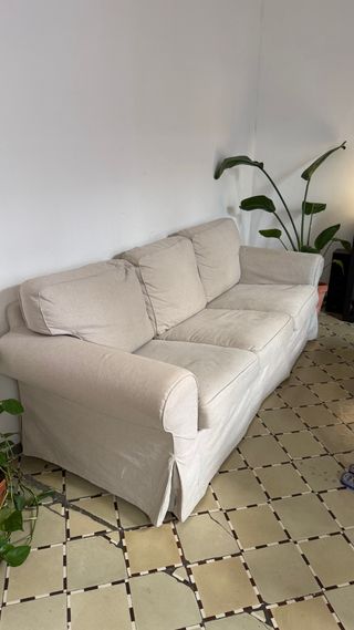 Sofá modular de tela en color beige. Se desmonta, fácil de trasladar. Precio con 4 cojines de lino + relleno (Zara Home): 185 - Tapicería de tela. - Estructura modular.