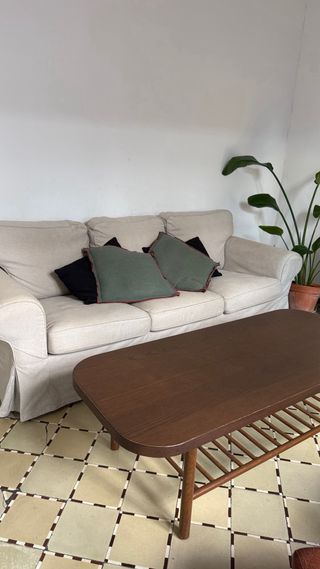 Se vende conjunto de salón compuesto por sofá, mesa de centro y cojines de lino. BUEN PRECIO! - Sofá de tela color beige. - Mesa de centro con estructura de madera. - Cojines decorativos en color negro y verde - de Lino Zara Home