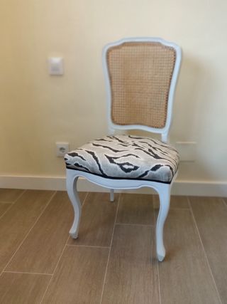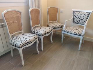 Tres sillas y sillón estilo clasico-moderno, tela estampado cebra 🦓...ideal en cualquier ambiente y estilo...terraza, salón, entrada, dormitorios.....