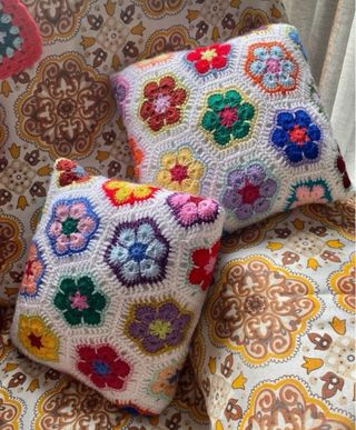 Dúo de cojines decorativos hechos a mano con un diseño de flores en mosaico hexagonal. PRECIO X PAREJA Preciosa decoración floral de ganchillo en colores vivos sobre fondo blanco. Son una dulzura; muy estilosos para añadir un toque shabby chic, retro vintage y calidez a cualquier espacio, tu mecedora favorita, al sillón de lectura, al dormitorio, la sala de costura, de juegos y manualidades... retro pop granny square africana flowers naranja amarilla purple ball sillón cortinas zara home maison du monde original figura sofá mimbre caña bambú natural decoración hippie rainbow ikea descatalogado teléfono a mano perchero
