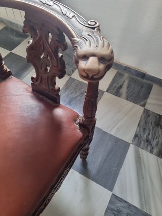 Sillón tallado en madera haciendo el tallado dos cabeza de león y asiento de piel.