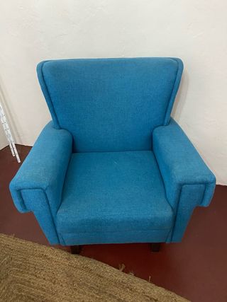 Acogedor sillón tapizado. - Diseño clásico con orejas. - Patas de madera. Hay dos sillones disponibles!