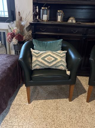 Elegante sillón tapizado en cuero verde, con patas de madera. - Diseño clásico y confortable. - Aporta un toque de distinción a cualquier espacio. Si te llevas los dos, el precio del conjunto son 80€