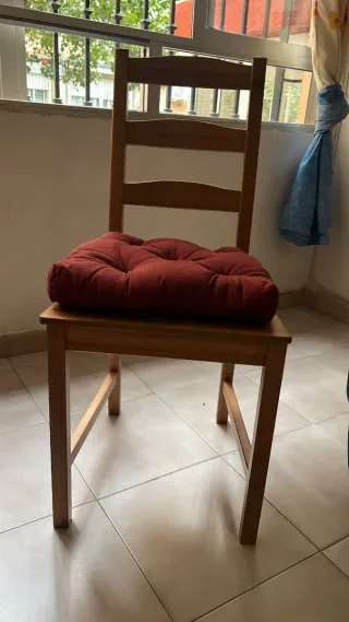 Se venden dos sillas de madera con cojines. - Estructura de madera. - Cojines de tela en color rojo.