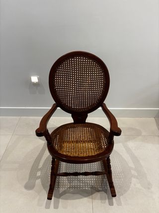 Mecedora antigua con un diseño clásico y elegante. Perfecta para añadir un toque de estilo a cualquier rincón. - Estructura de madera maciza. - Asiento y respaldo de ratán tejido. - Brazos curvos para mayor comodidad.Dispongo de dos unidades