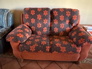Acogedor sofá de dos plazas con un alegre estampado floral. - Tapicería de tela. - Diseño de dos plazas. - Tonos marrones y naranjas.
