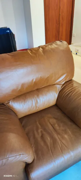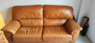 Sofá de dos plazas en buen estado excepto por pequeño defecto visible en una de las fotografias - Tapicería de piel. - Color marrón. - Dos plazas de 70cm cada una Urge la venta