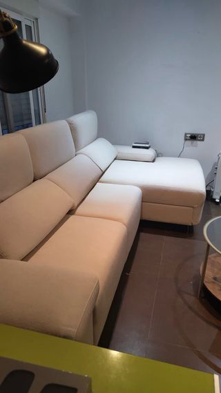 Comprado en enero de 2026 Lo vendo porque tengo que mudarme de casa y en la nueva ahora no me entra Sofá chaiselongue de tela en color beige. Esquinero con chaise longue. - Diseño moderno y confortable. - Tapicería de tela. - Color beige neutro.