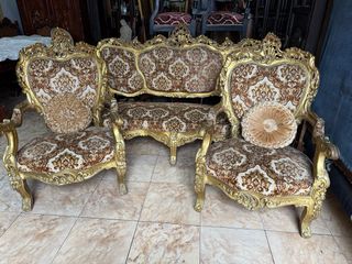 Elegante juego de tresillo con un diseño clásico y lujoso. - Tapicería con estampado floral en tonos beige y dorado. - Estructura de madera tallada y dorada. - Incluye dos sillones individuales y un sofá de dos plazas. - Dos cojines redondos decorativos a juego.
