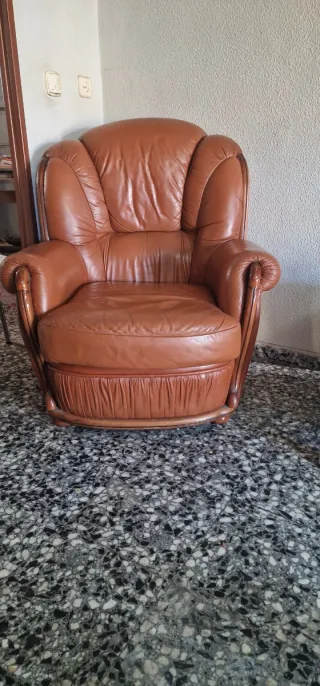 Conjunto de dos sillones elegantes, combinando la calidez de la madera con la sofisticación del cuero. - Diseño clásico y confortable. - Base de madera con detalles curvos. - Tapicería de cuero de alta calidad.
