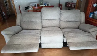 Sofá relax de tela en tonos beige y marrón. Su diseño se adapta a cualquier salón. - Tapicería suave al tacto. - Reposapiés extensible para mayor comodidad.