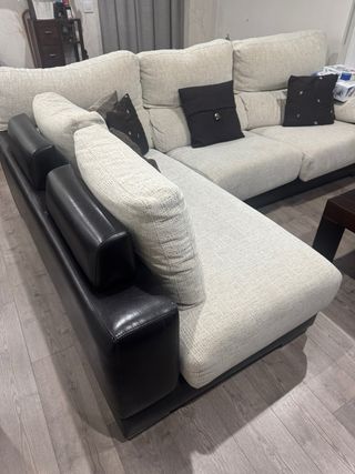 Sofá de tres plazas con un diseño moderno y cómodo. Combina tapicería en tela y polipiel. - Estructura de polipiel marrón. - Cojines de asiento y respaldo en tela beige.