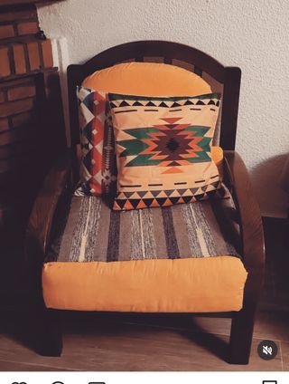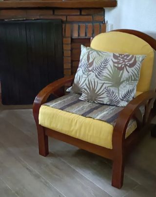 Pedazo de sillón individual en madera maciza. Viene con los cojines amarillos. Es una pasada.